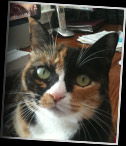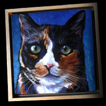 | Portrait of CALLIE (framed in floating maple frame) Bewitching Calico living in San Diego, CA 10x10", acrylic on canvas, November 2011 |